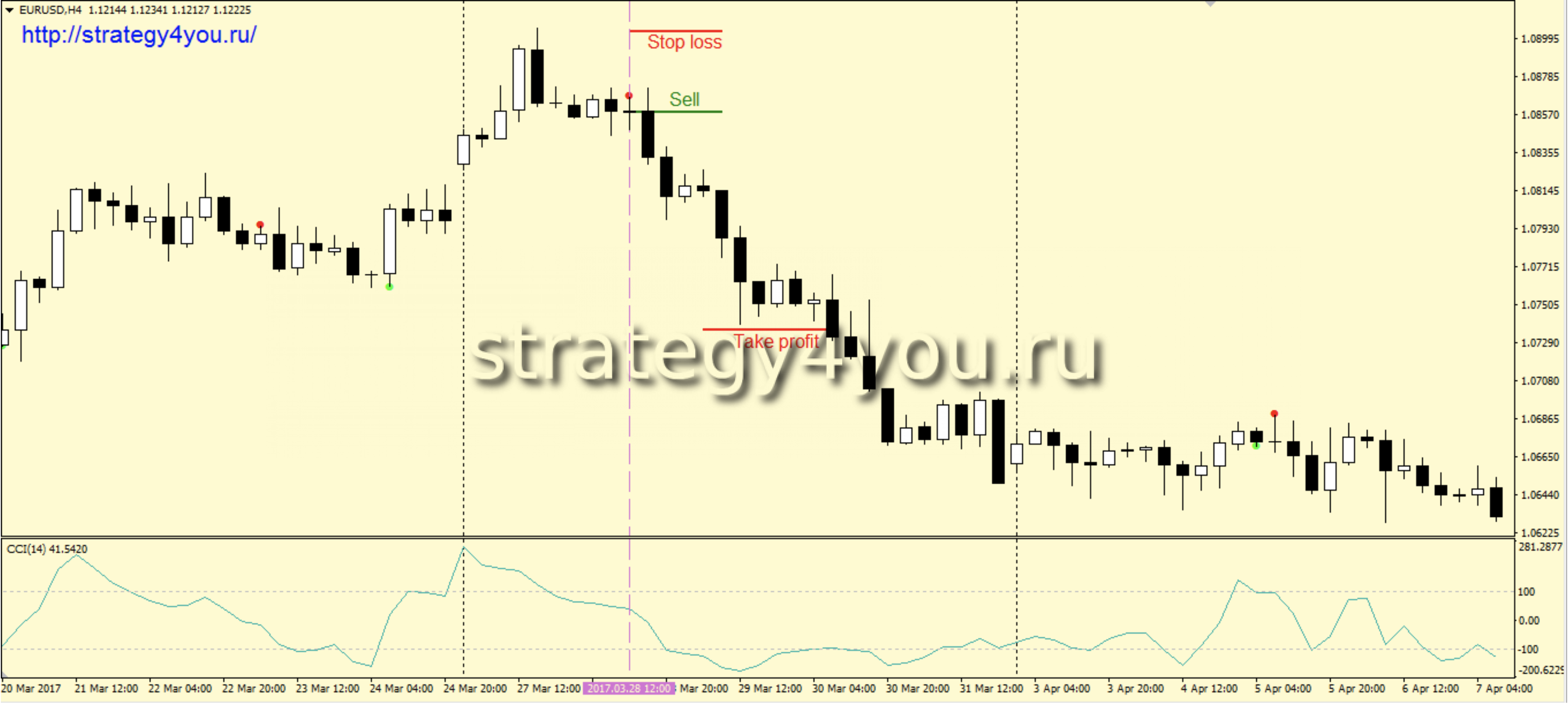 2) Индикатор CCI падает по сравнению со значением предыдущей свечи.
