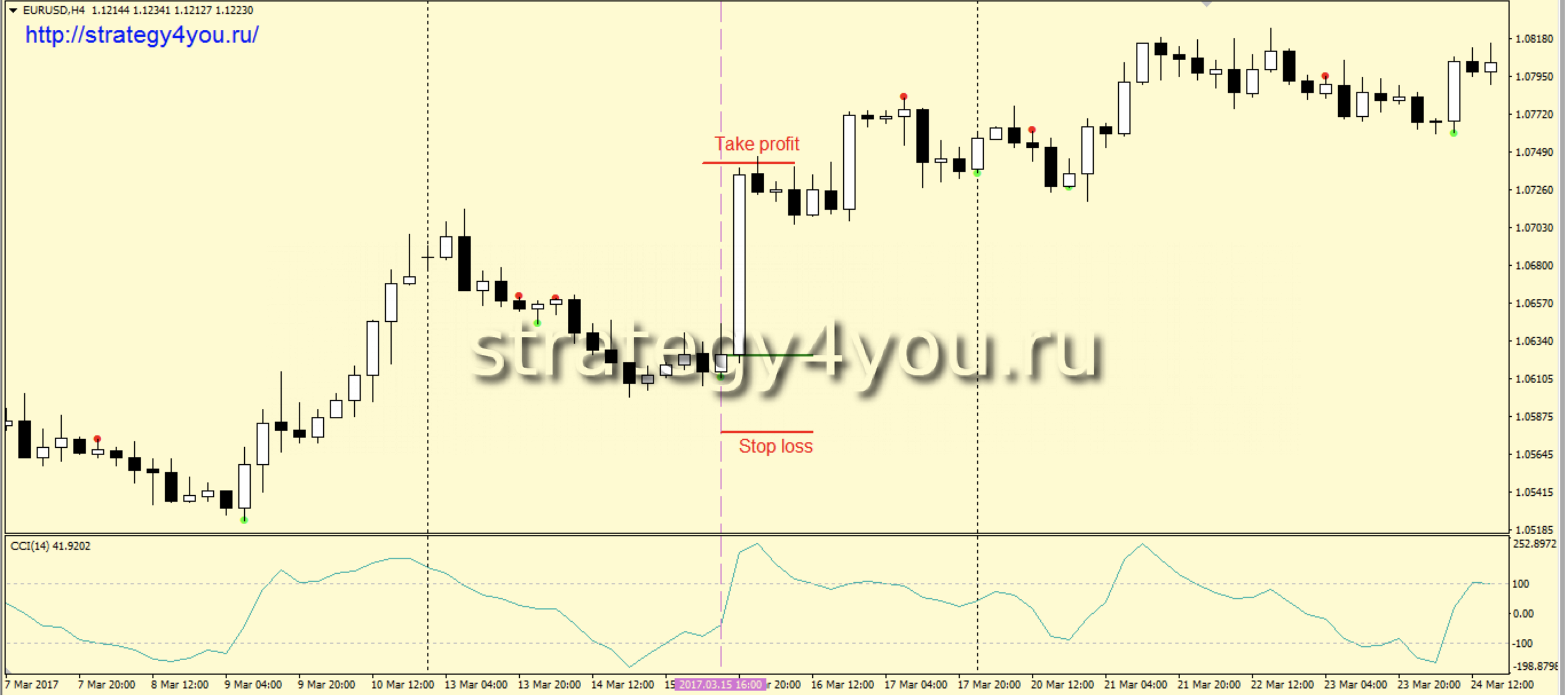 - Индикатор CCI с периодом 14 и с добавленными уровнями 100 и -100.