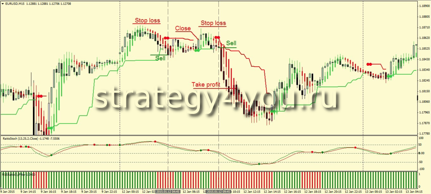 2) На индикаторе RaitisStoch зеленая линия находится выше красной и между ними имеется просвет. Если эти линии начинают сходиться, то есть расстояние между ними явно уменьшается, то такой сигнал мы игнорируем.