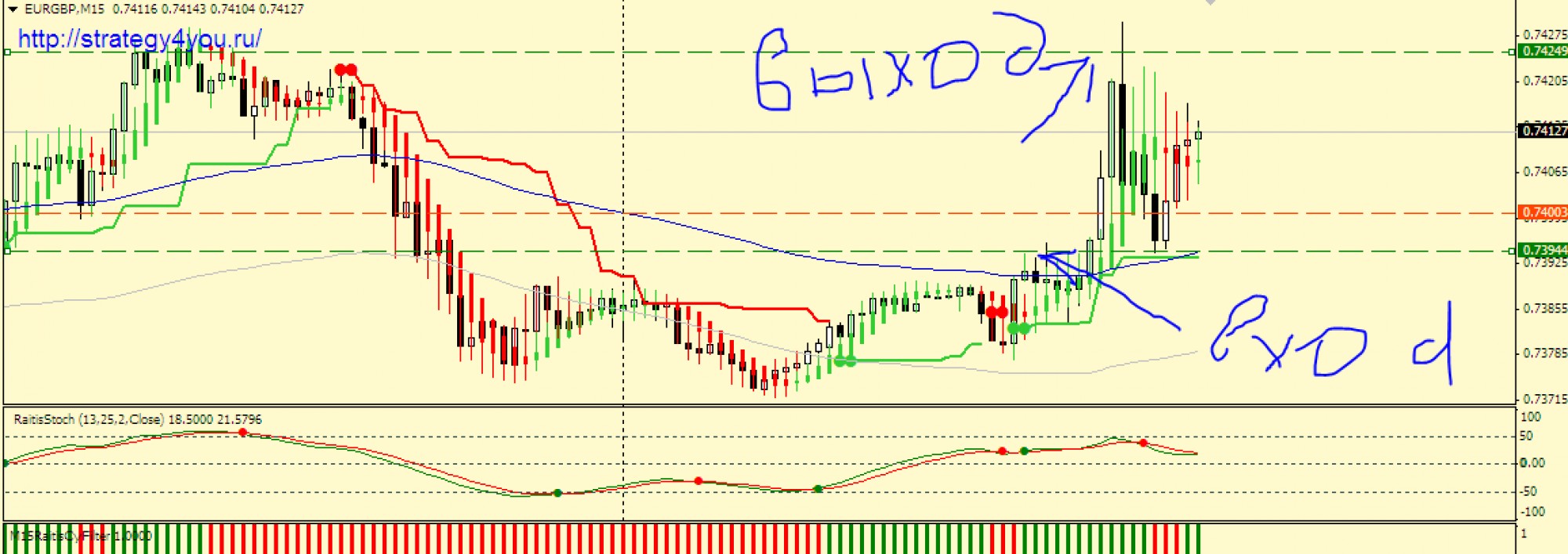 2) На индикаторе RaitisStoch зеленая линия находится ниже красной и между ними имеется просвет. Если же эти линии начинают сходиться, то есть расстояние между ними явно уменьшается, то такой сигнал мы игнорируем.