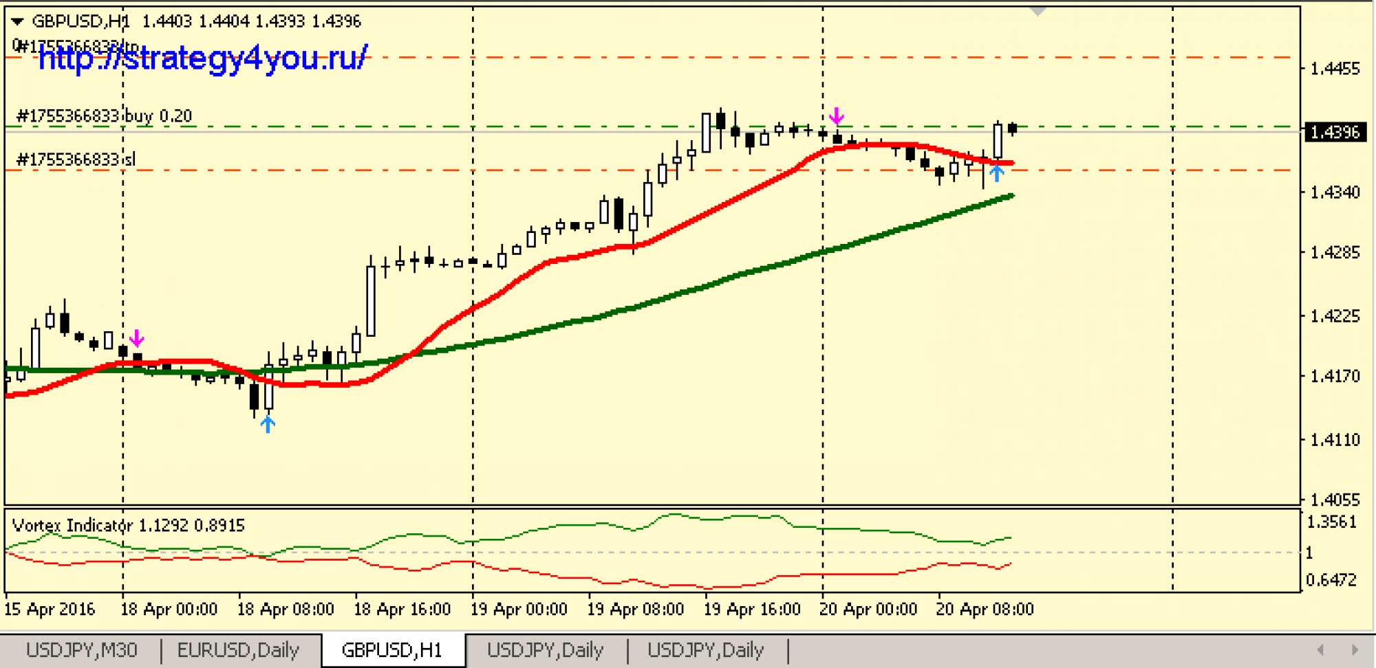 2) Красная линия индикатора Vortex находится выше зеленой линии этого же индикатора и так же выше уровня 1.