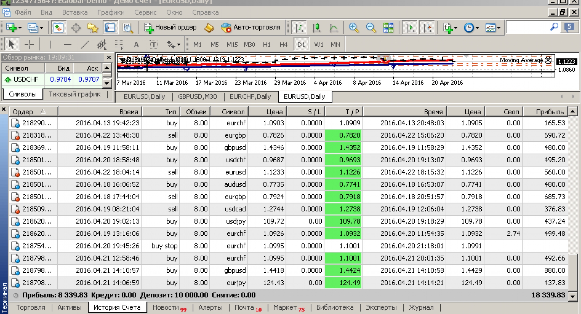 Из-за некоторых особенностей индикаторов на истории удалось просмотреть только период с декабря 2015 года до апреля 2016 года. За этот период была показана прибыль в размере +900 пунктов, что довольно неплохо. Максимальная просадка составляла порядка 130 пунктов.
