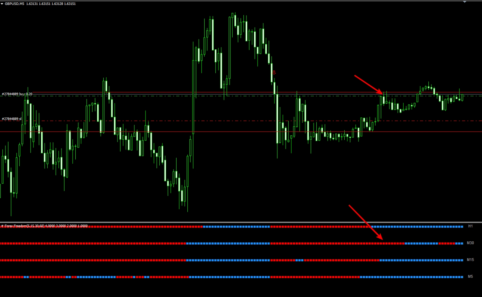 1) Все четыре строки индикатора Forex Freedom Bars нарисовали красные квадраты.