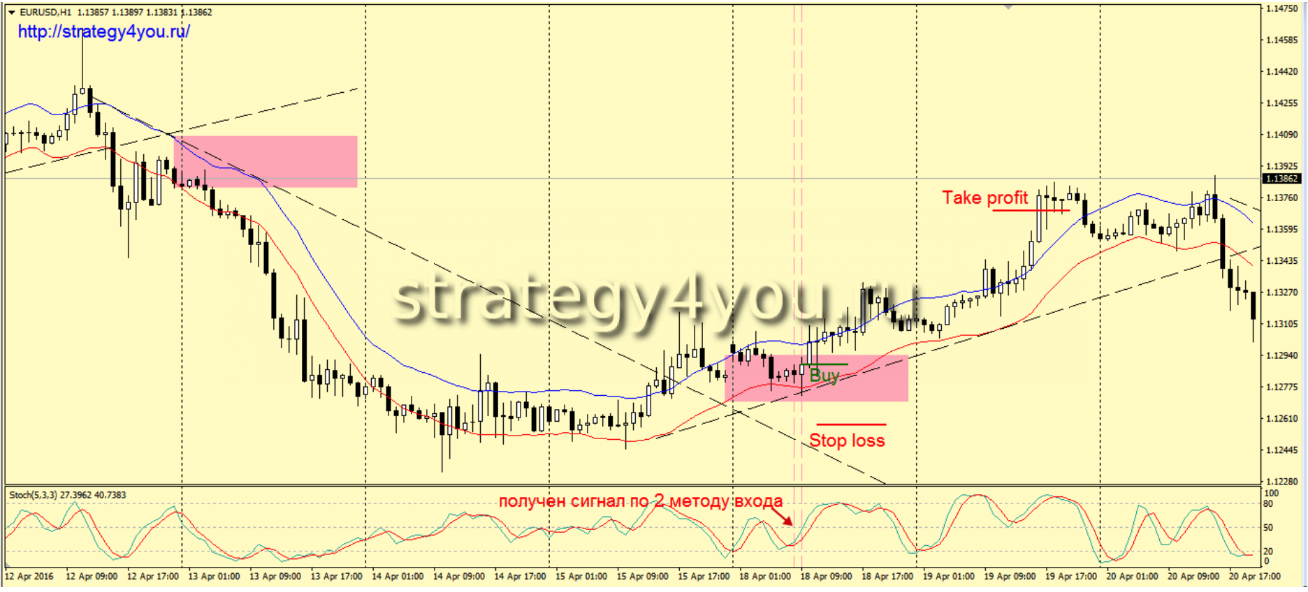 2-ой метод входа: цена находится в определенной нами зоне, а индикатор Stochastic находясь ниже уровня 50 разворачивается вверх (сигнальная линия ниже основной).