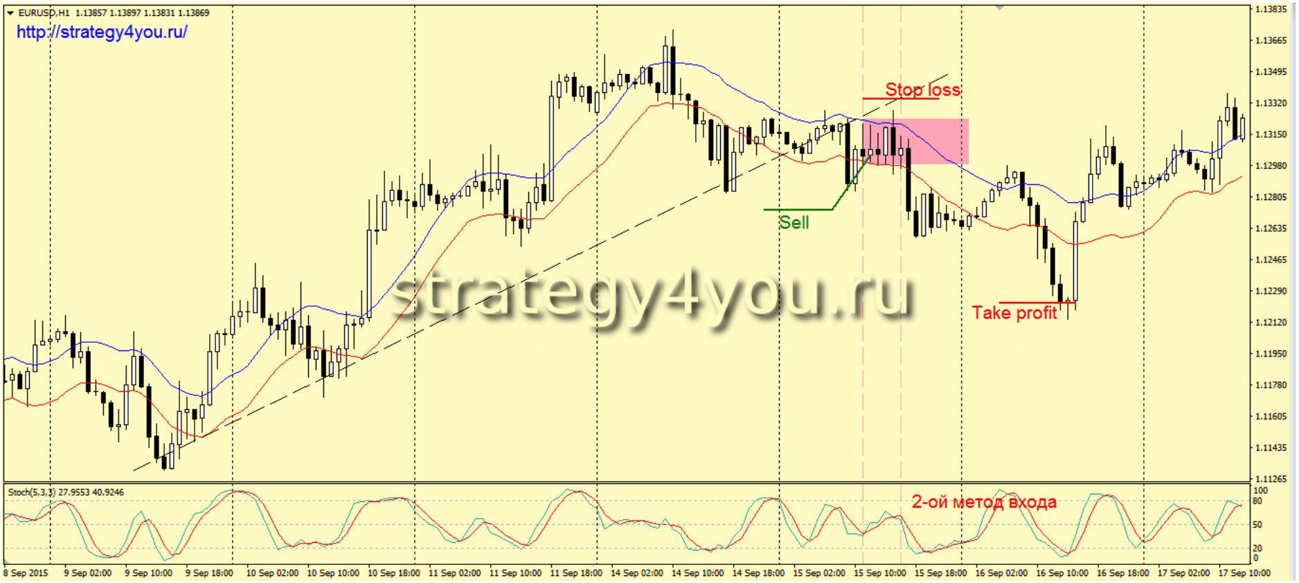 2-ой метод входа: цена находится в определенной нами зоне, а индикатор Stochastic находясь выше уровня 50, разворачивается вниз (сигнальная линия выше основной).