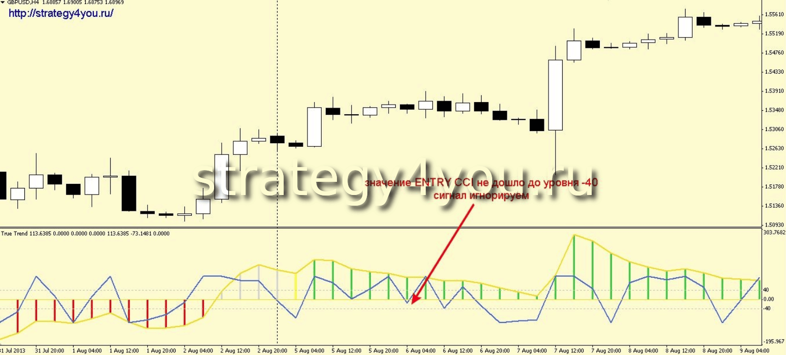 2) Если ENTRY CCI ушел против тренда, но возвратился так и не коснувшись уровня 40 (-40) то сделку заключать не стоит.