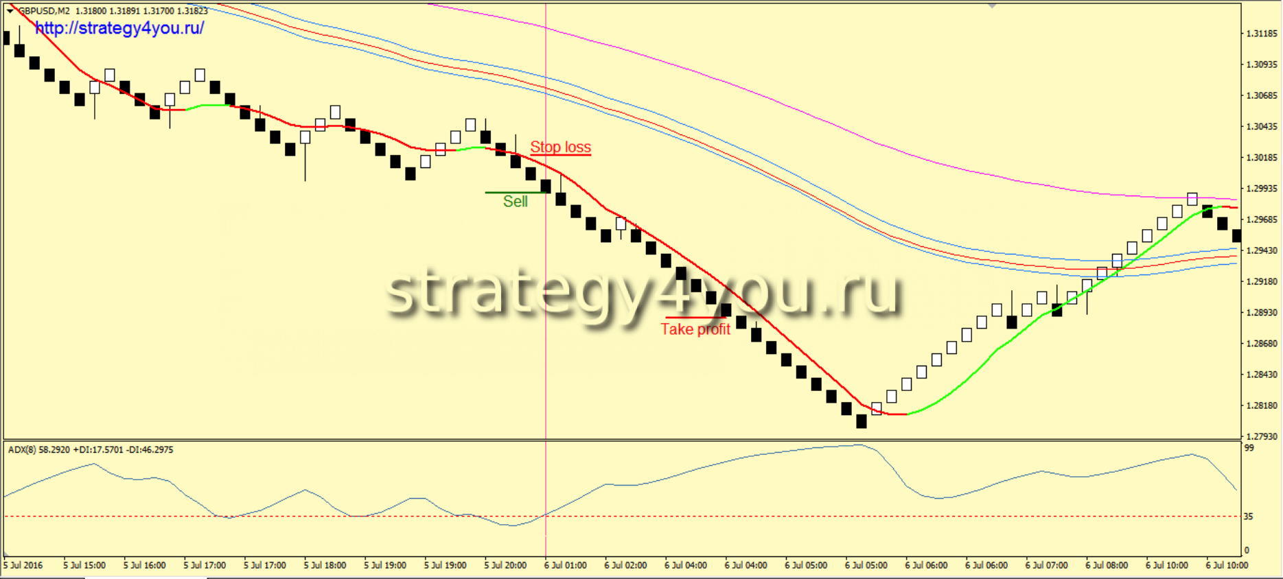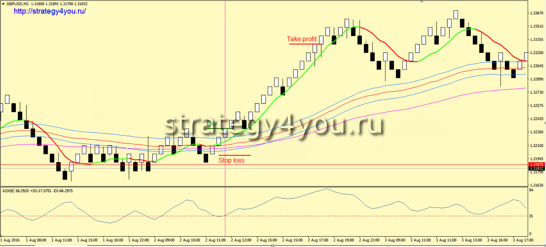 4) Только после получения всех сигналов индикатор ADX должен пересечь снизу вверх свой уровень 35. Так же можно рассматривать сигнал, если он получен одновременно с сигналом от индикатора Non Lag MA, но точно не раньше.