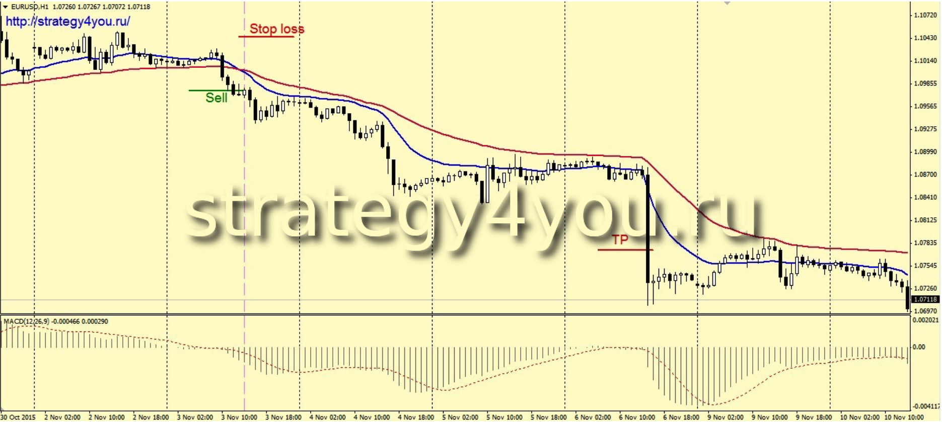 3) Как только мы получили все выше описанные сигналы, открываем сделку на продажу. Пока открытая сделка не будет закрыта, прочие сигналы следует игнорировать.