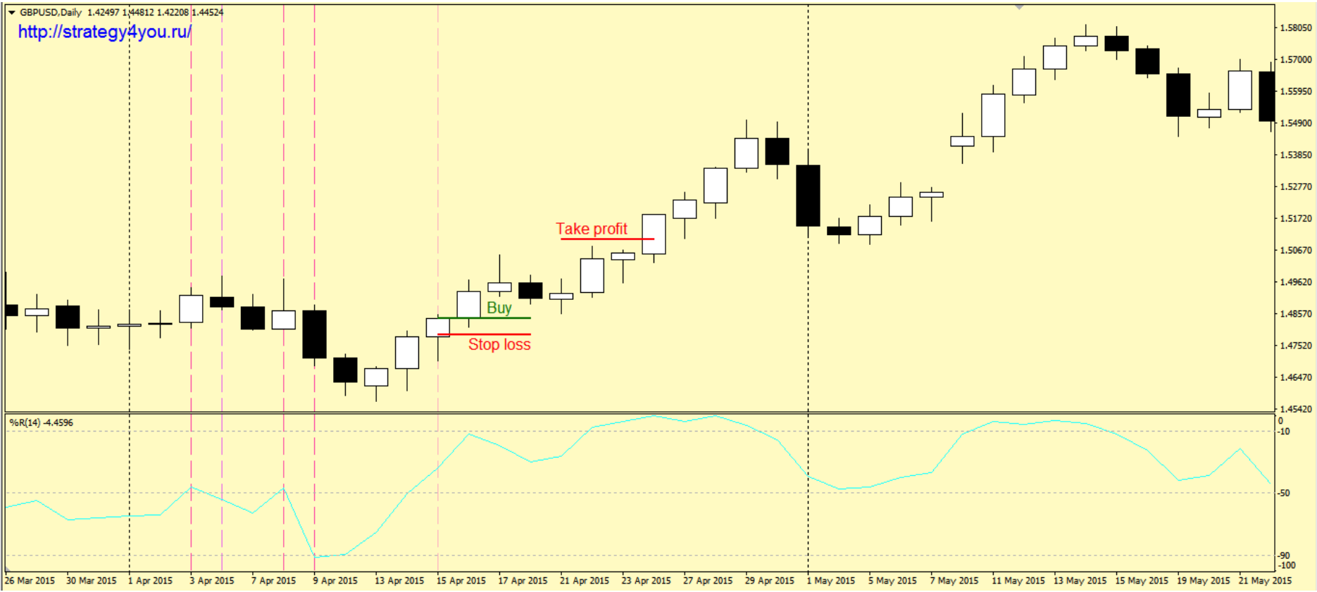 Стратегия форекс «WPR» хорошо подтверждает утверждение: «чем проще стратегия, тем лучше», а основана она всего лишь на сигналах одного индикатора форекс и четких правилах входа и выхода, причем данный индикатор довольно сложно отнести к широко применяемым трейдерами.