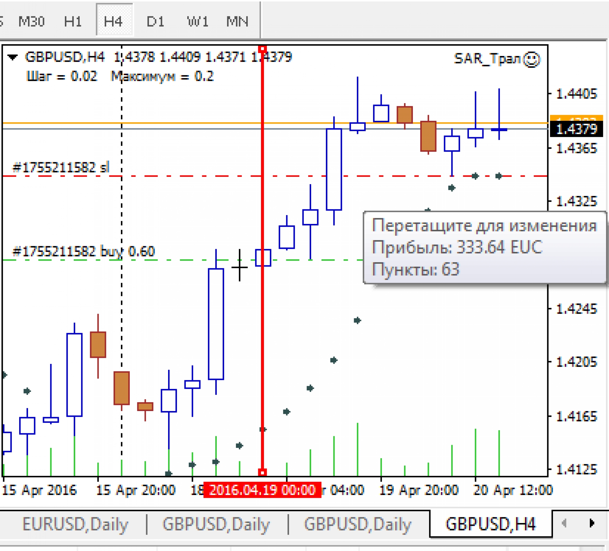 Пробую тралить SAR-ом на младшем ТФ, а ТП по такому случаю задрал повыше.