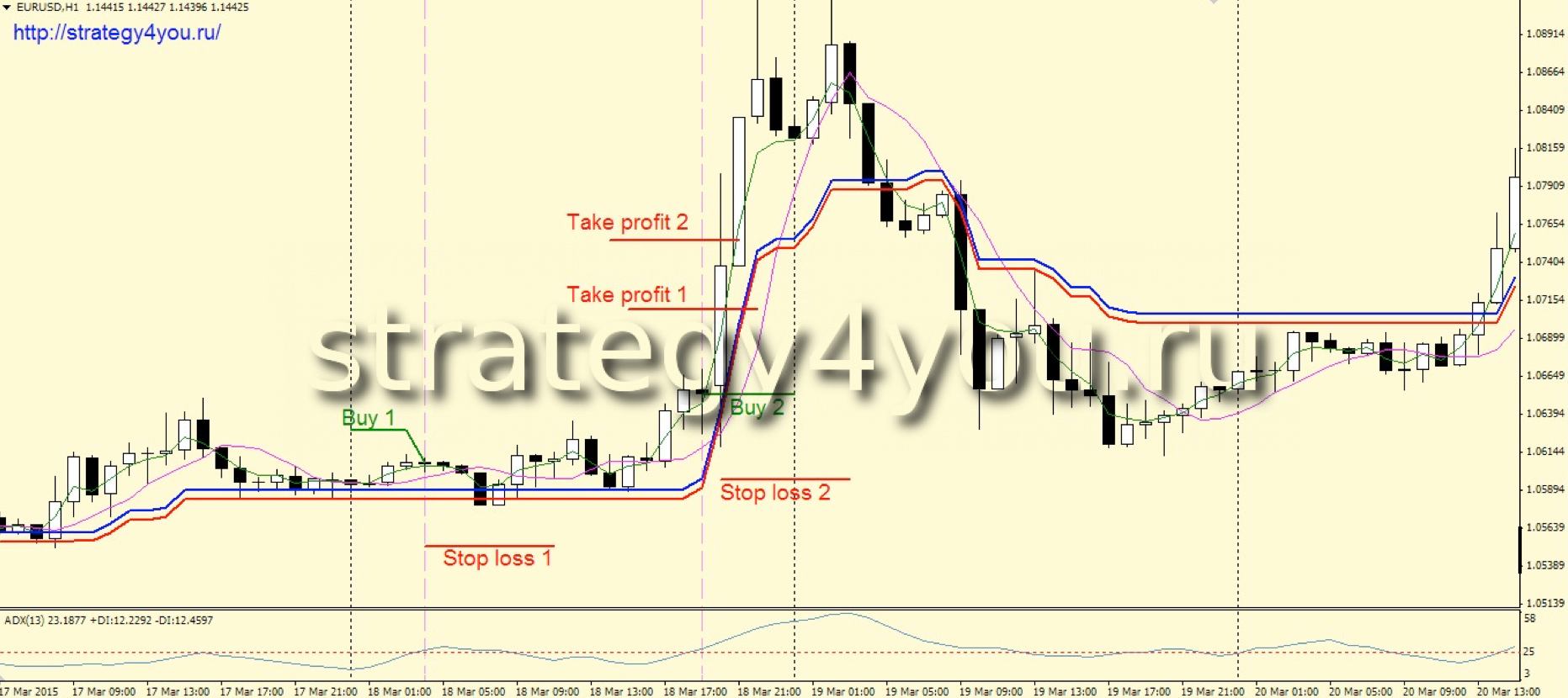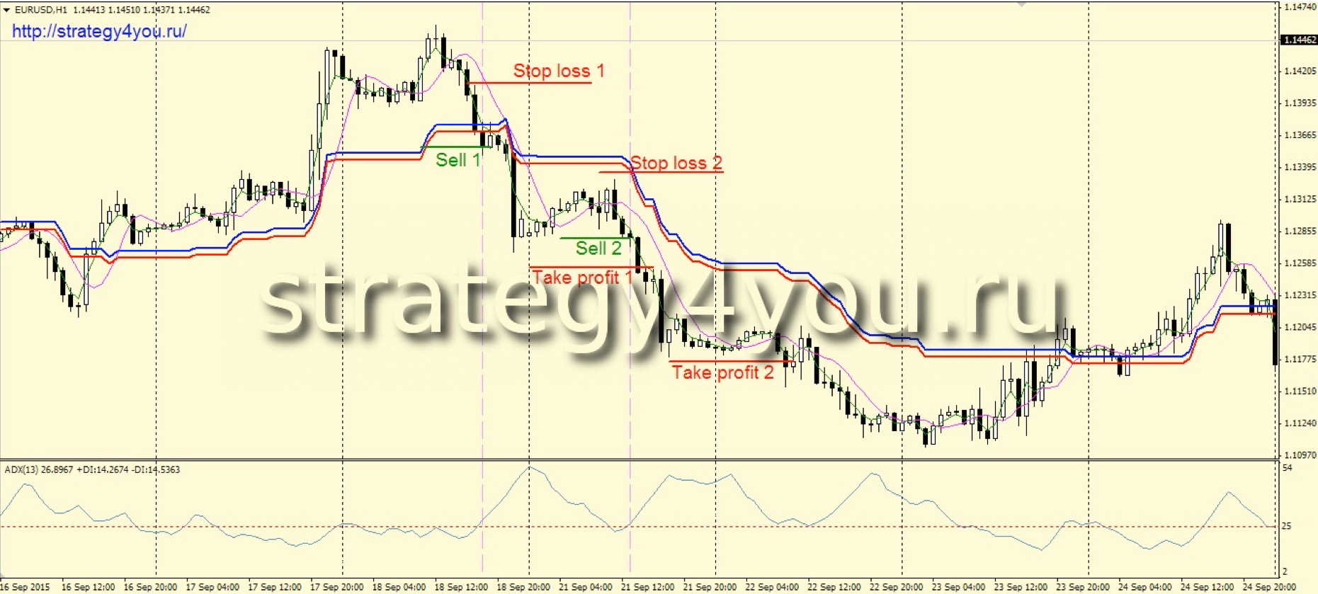 4) Как только все, вышеописанные сигналы получены, открывается сделка на продажу. Новый сигнал в том же направлении можно получить только после того, как индикатор ADX опустится ниже своего уровня 25. Если текущая сделка уже находится в положительной зоне, то она не мешает открытию еще одной сделки, в случае формирования нового подтвержденного сигнала всеми условиями стратегии.