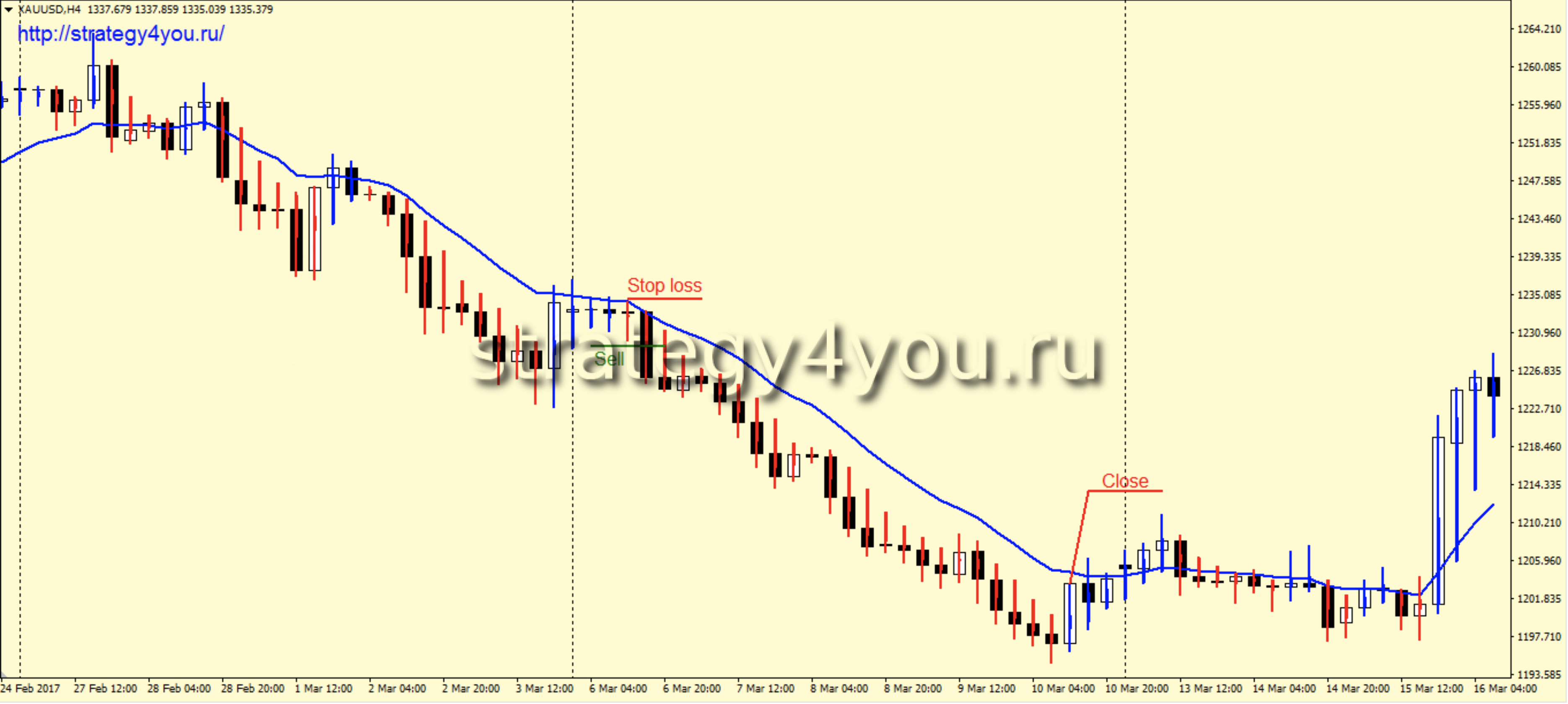 4) На 5 пунктов ниже минимума последней свечи устанавливается отложенный ордер на продажу – Sell Stop.