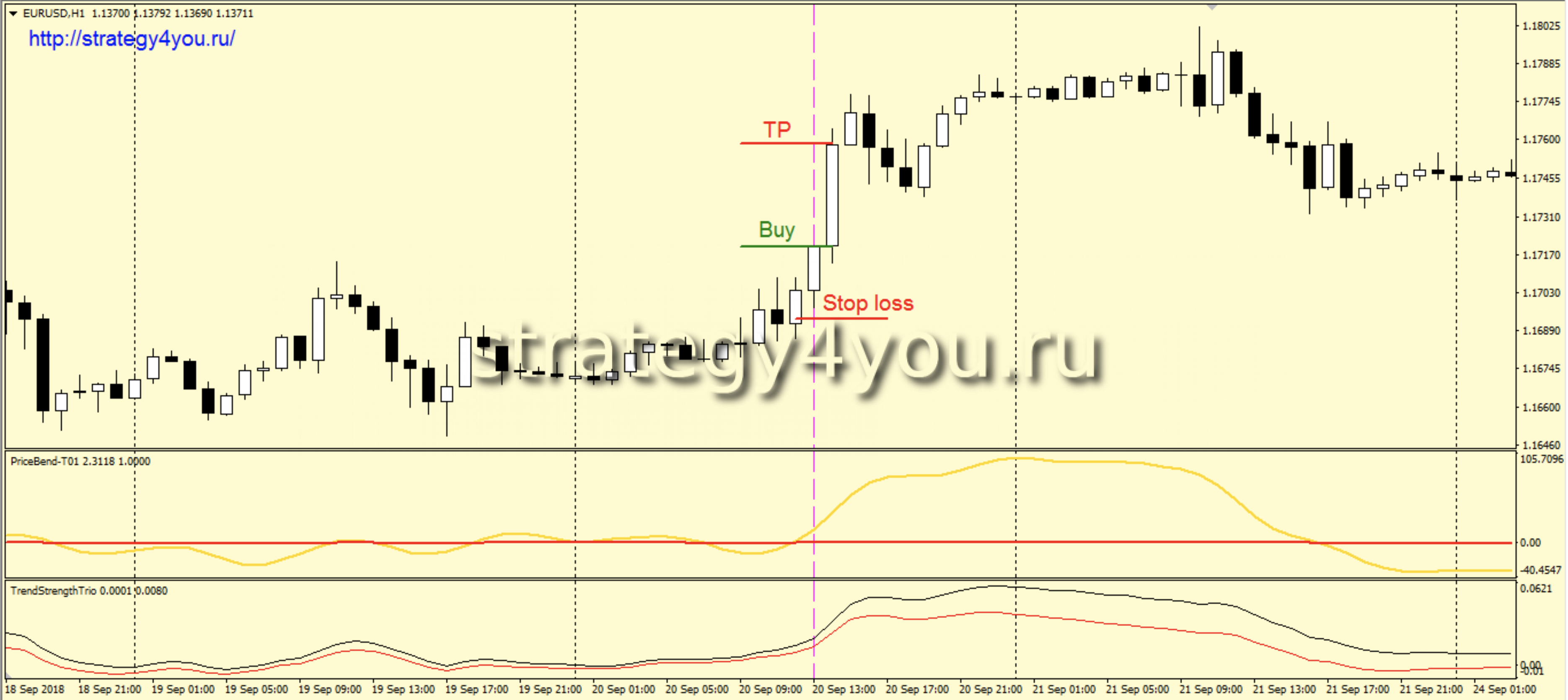 Стратегия форекс «Trend Bend» генерирует точку входа внутри уже существующего тренда. То есть на рынке уже имеется заданное трендовое движение и в момент его очередного подтверждения получается сигнал на вход в направлении движения цены. Один из индикаторов показывает наличие самого тренда, а второй дает точку входа по этому направлению.