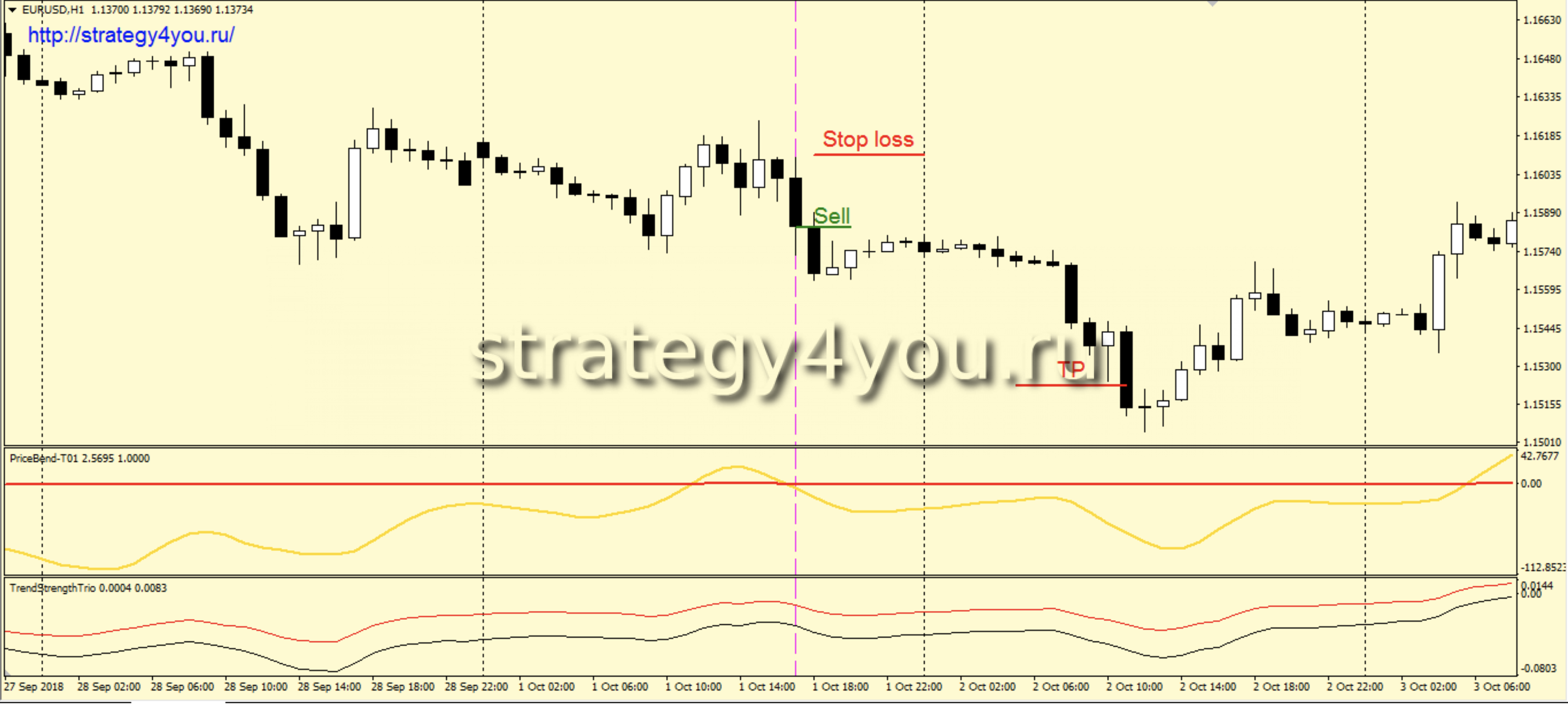 2) На закрытии H1 свечи основная желтая линия индикатора Price Bend-T01 пересекает сверху вниз горизонтальную красную линию.