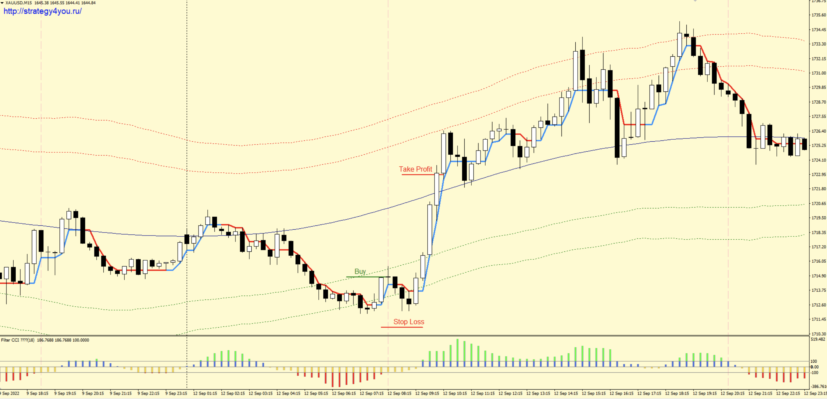 4) Стоп-лосс устанавливается под последним минимумом индикатора Filter CCI, но не меньше 40 пунктов и не больше 80 пунктов.