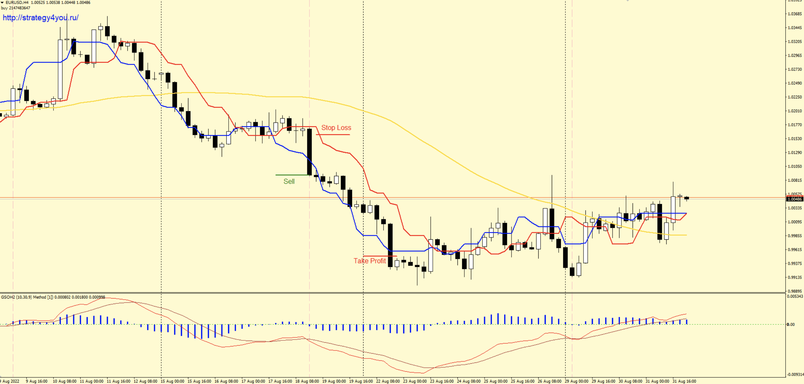 4) Именно это пересечение, при условии сохранения всех предыдущих сигналов и является триггером для заключения сделки на продажу.