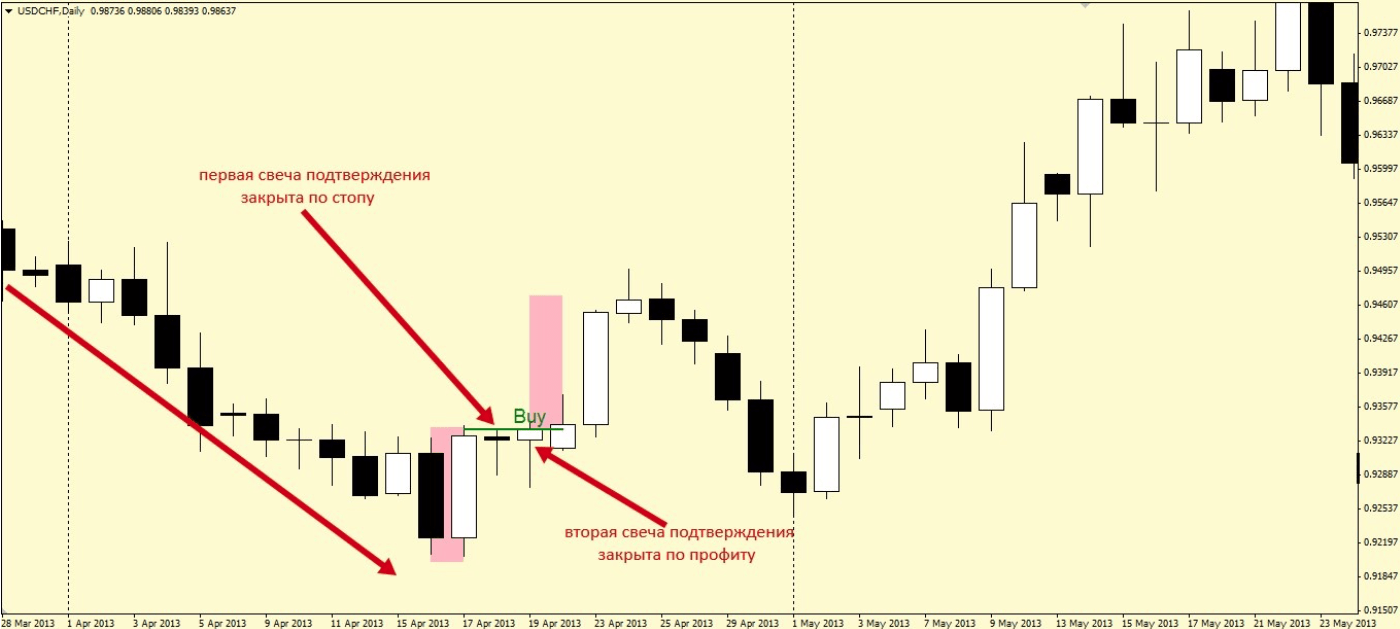На рисунке ниже, при первом входе ордер закрыт по стопу и по условиям после появления второй отбойной свечи был открыт еще один ордер в ту же сторону, который достиг цели.