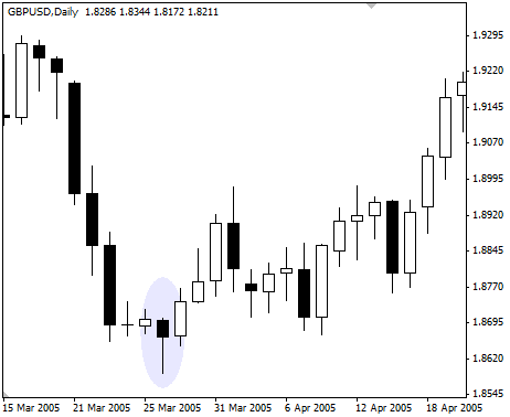 - Когда нисходящий тренд завершается, формируется свеча с длинной верхней тенью. Она отмечает собой минимум тренда.