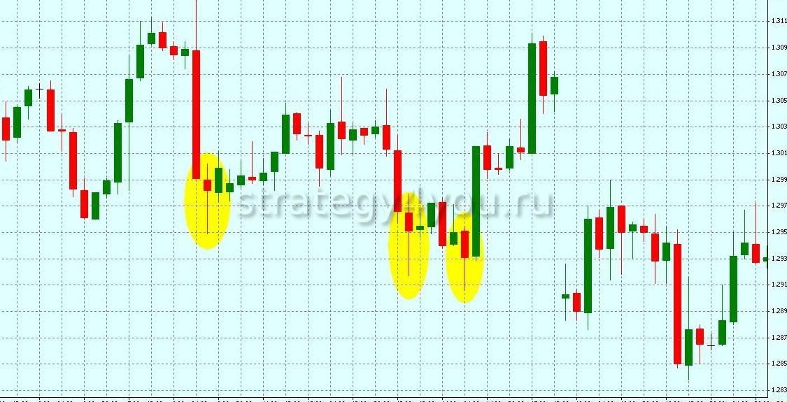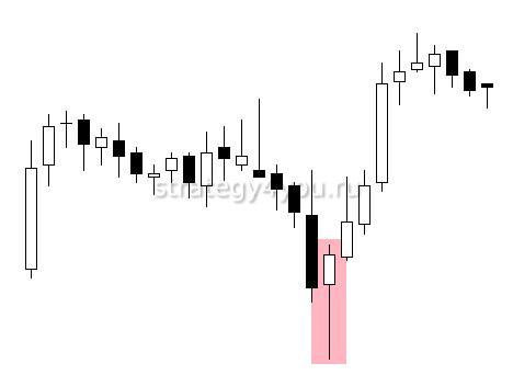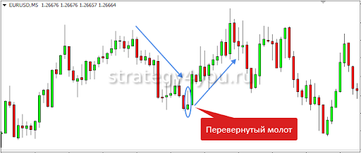 - Сильный Молот бычий. Трейдер должен войти в сделку при открытии следующей за ним свечи.