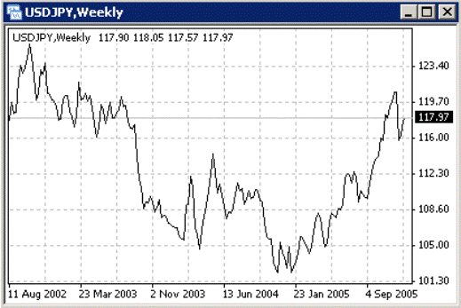 Линейный график предполагает накладывание на оси абсцисс единичного отрезка времени (выраженного в минутах, часах, днях, месяцах и т.д.), тогда, когда ось ординат является арифметической. Чтобы построить линейный график, используют цены закрытия – цены последних котировок каждого периода (каждой минуты, часа). Полученные в результате такого построения графика точки соединяют между собой прямые линии. Линейные графики актуальны на небольших промежутках времени (до пары минут).