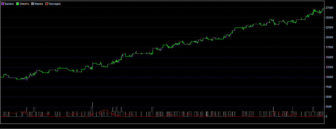 Из графика видим, что стратегия достаточно стабильно отрабатывала за этот период. Больших просадок не было.