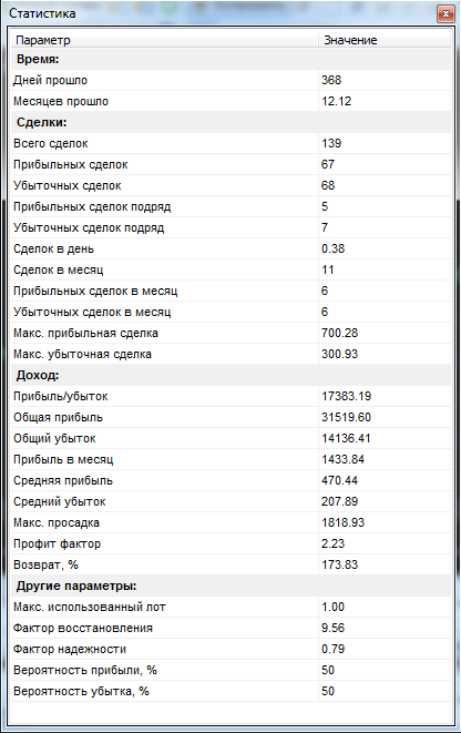 Результат за 12 месяцев: +173.83%. Соответственно стратегия прибыльна и стабильна. А значит ее вполне можно рассматривать для использования в своем портфеле.