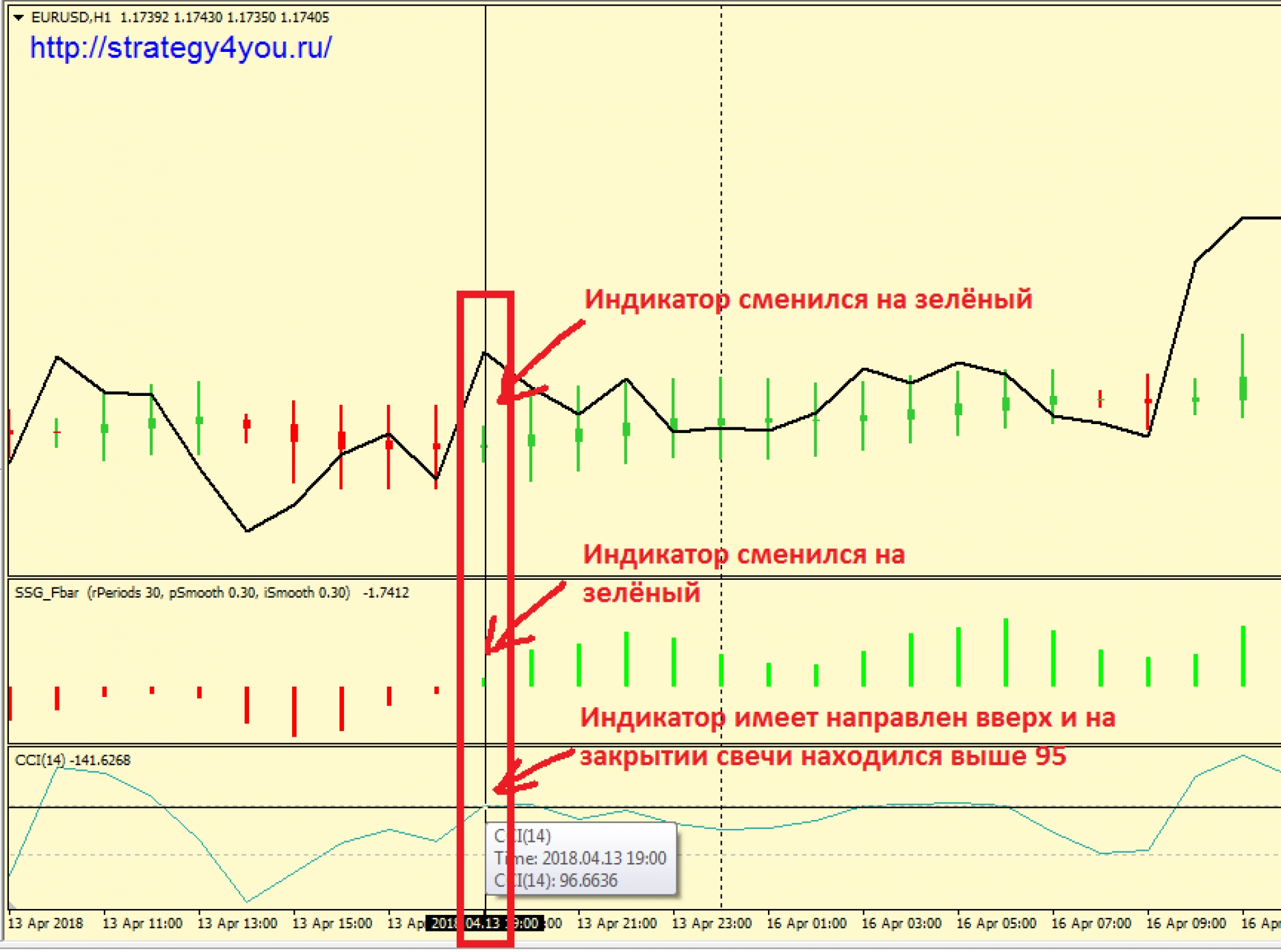— CCI направлен вверх и на закрытии свечи имел значение больше 95.