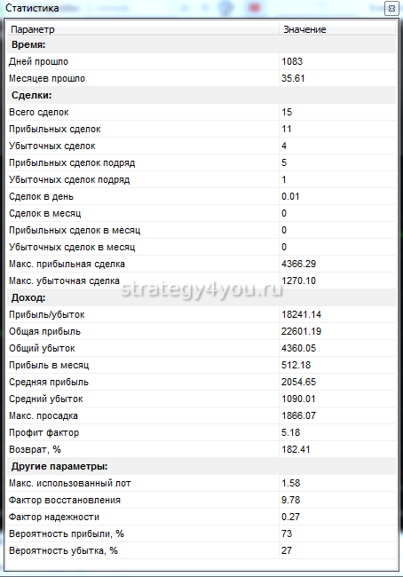 Заключение: прибыль за 36 месяца составила +182,41% по паре GBP/USD — совсем не много, учитывая что тест провели за 3 года. Но стратегия дневная + только по 1-й паре — было 15 сделок, поэтому использовать стратегию как основную конечно же не сосем рационально, но если как дополнительную — вполне даже неплохо.