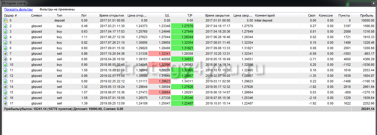 Подробную статистику этого теста для Фунт-доллар по всем сделкам торговой системы смотрите в этой таблице: