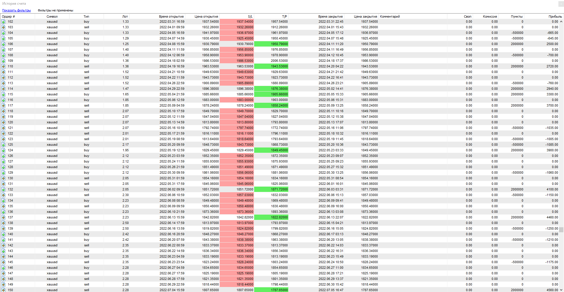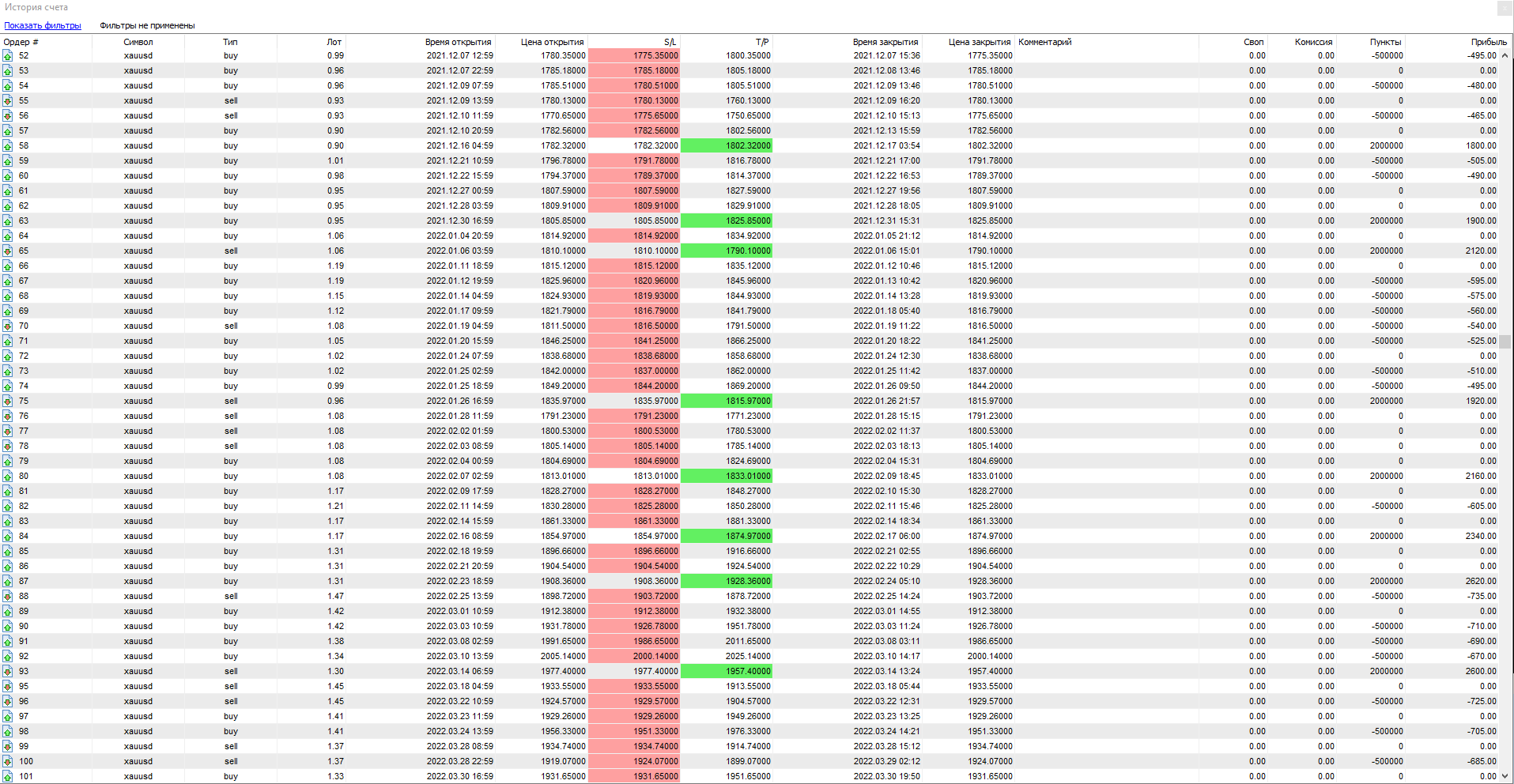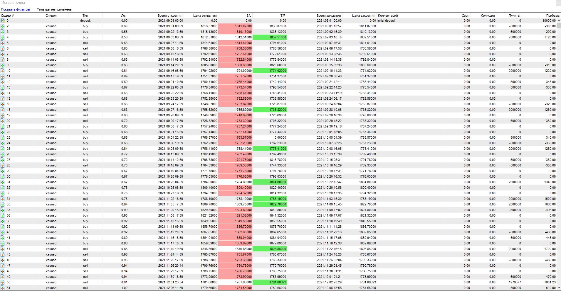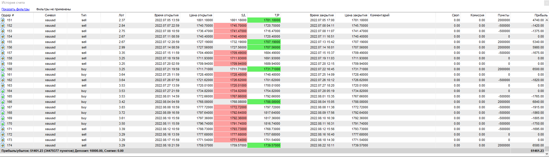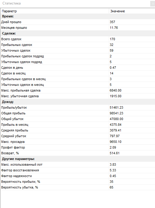 Всего за 1 год теста было открыто сделок — 170. Из них закрыто с прибылью — всего 32. Убыточных — 59, остальные — закрыты в безубыток.