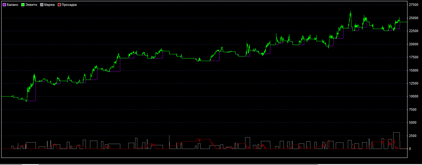 График мы видим за 1 год, в общем нет резкого взлета, но движение поступательное вверх, с небольшими просадками. Но учитывая что стратегия достаточно простая и она опубликована на этом сайте почти 10 лет назад, то результат, я бы сказал, все равно хороший!