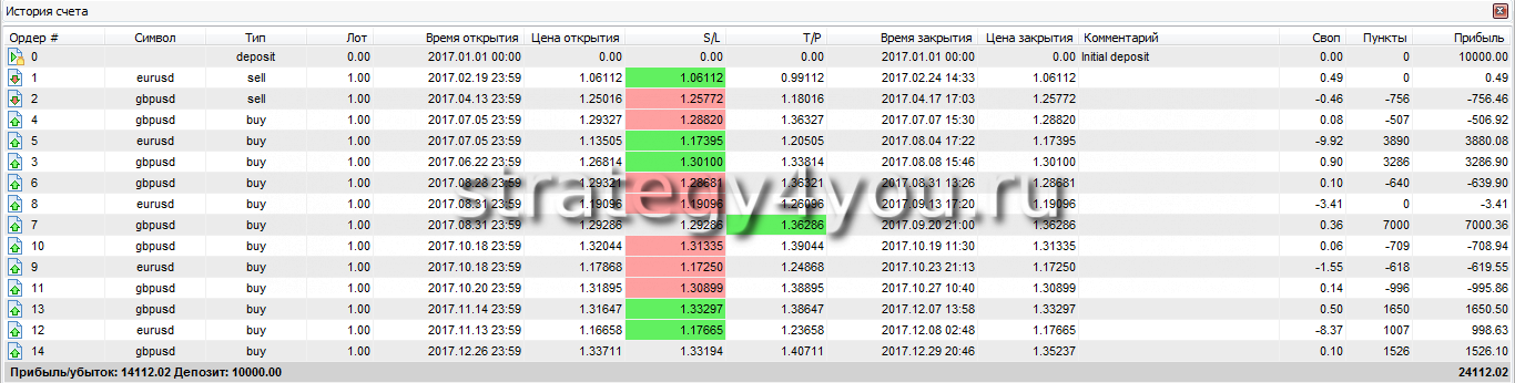 Как видим, график данного теста получился хотя и восходящий за 1 год, но с просадками, а так же периодами застоя. Но стратегия и была создана для интервалов W1-D1, поэтому это вполне нормальная ситуация — сделок не так много, даже учитывая что торговля велась по евро-доллару и фунт-доллару одновременно.
