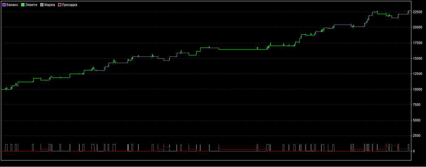 По графику видно, что стратегия оказалась более-менее стабильной и прибыльный — без больших просадок.