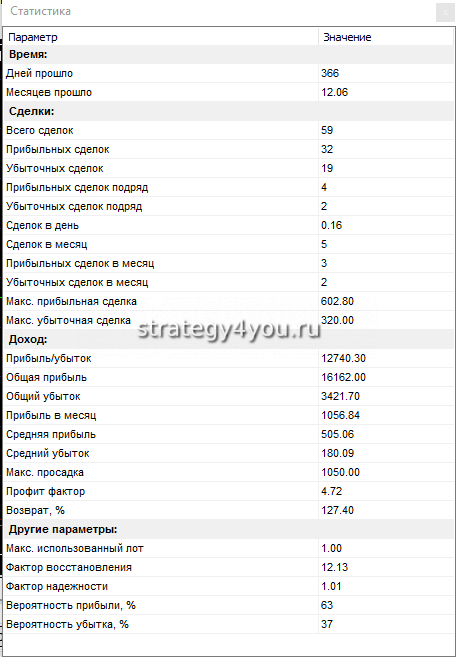 Стратегия является стабильной и прибыльной. Общая прибыль за 1 год: +127% — совсем неплохой результат!
