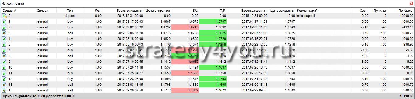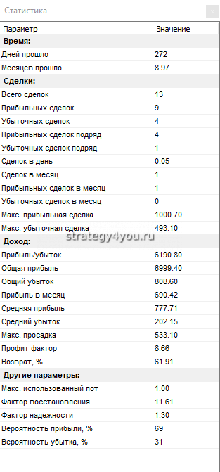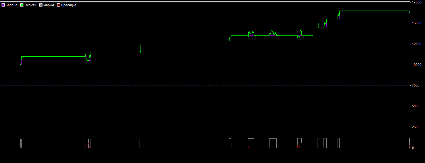 Как мы видим от теста, сделок за этот период совсем мало — всего 15, но тем не менее стратегия прибыльна и показывает стабильную динамику, а это главное!