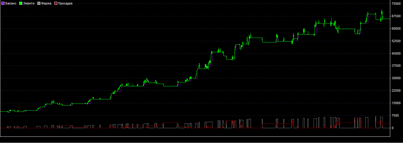 График восходящий, равномерный, но не стоит забывать что это D1 — сделок очень мало! Лот брали динамический, поэтому с фиксированным прибыль была бы меньше.