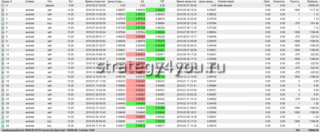 Результат за год не большой: +96,46% — но это говорит о том, что стратегия для AUDCAD вполне рабочая и заслуживает внимания, поэтому рекомендую и ее к добавлению в свой портфель трейдера.
