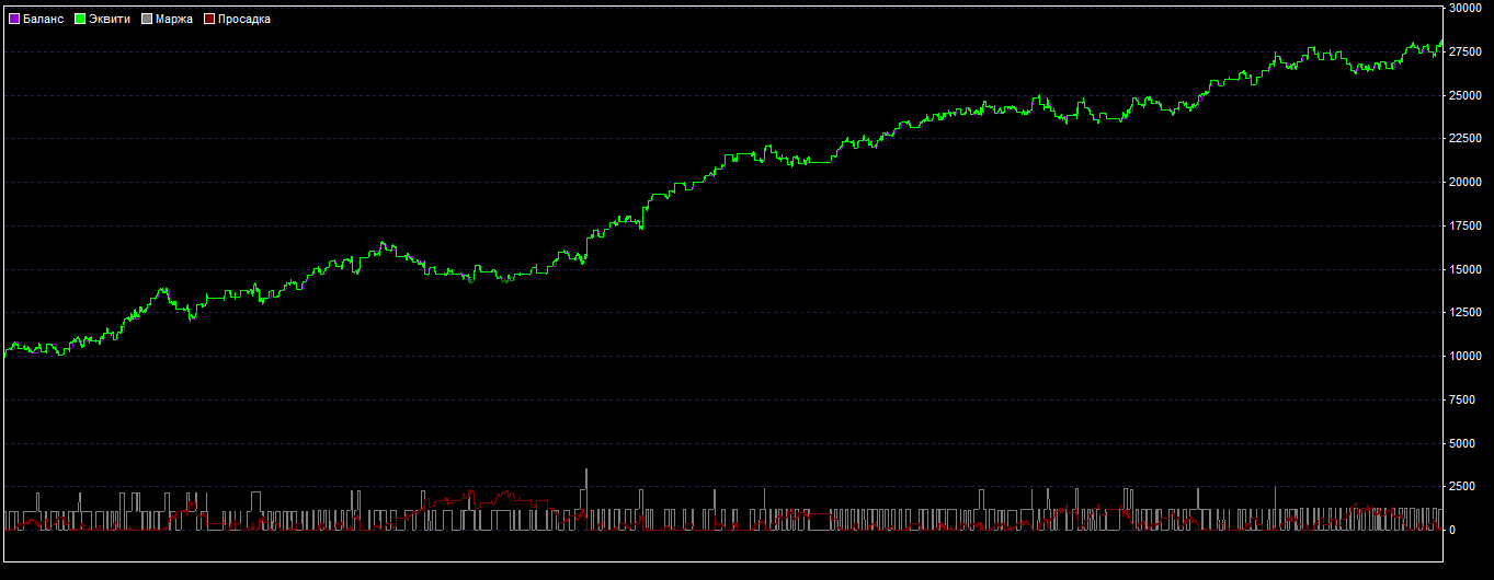 График мы получили достаточно стабильный, с небольшими просадками, но общая восходящая тенденция сохранилась, что говорит о стабильности этой стратегии на протяжении 1 года.