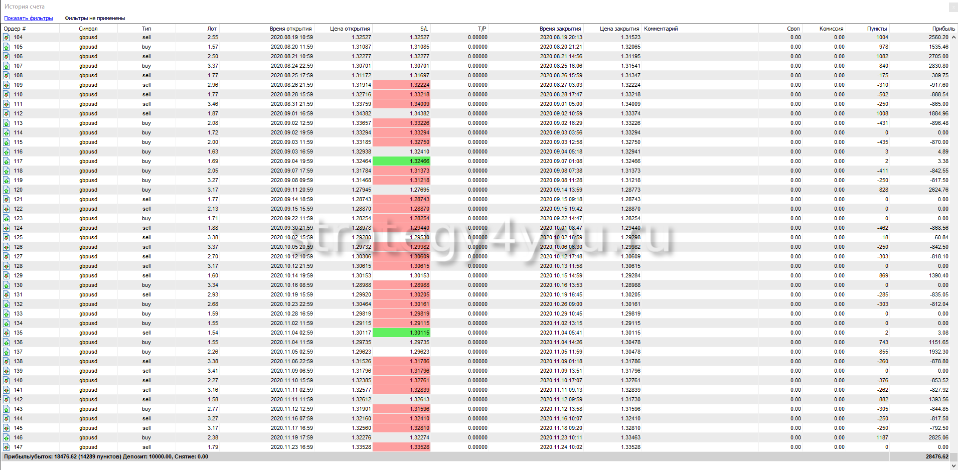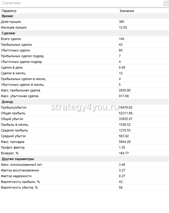 Всего сделок за 1 год на H1 интервале — 145. Прибыльных — из них всего 43. Убыточных — 60, остальные были закрыты по безубытку (в ноль — в точке открытия).