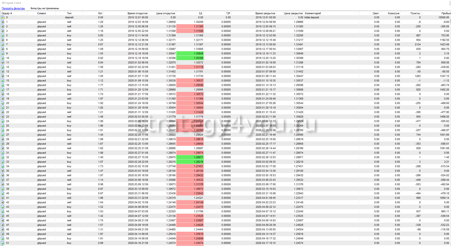 Подробный отчет по сделкам за период тестирования по торговой стратегии «Бандитос»: