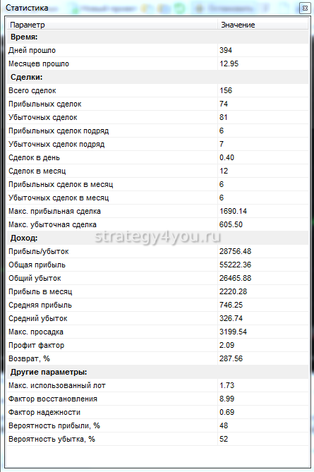 Заключение: прибыль за 13 мес +287,56%, график стабильный, поэтому стратегия вполне рабочая и рекомендую ее для использования.