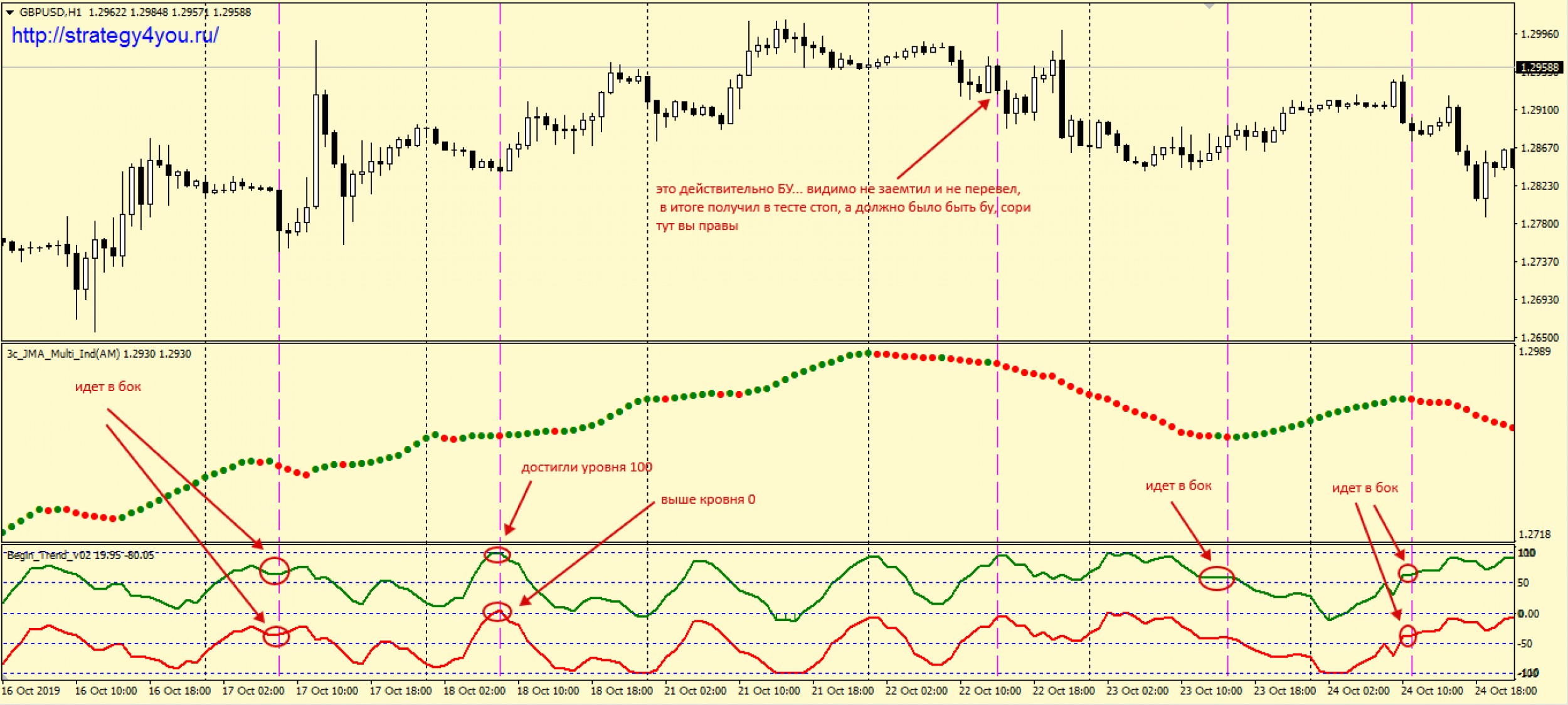 это очень и очень хорошо, что вы проявили должную бдительность и решили прежде всего проверить сделки! Я всегда именно к этому и призываю. Прежде чем торговать, на реале нужно любую систему все равно проверить самому и на истории, и потом на демо какой-то период. Так что тут вы правильно подошли. Но вот при знакомстве с самой стратегией все же нужно быть немного более внимательным, чтоб потом не было проблем из-за маленьких пропущенных нюансов. Не нужно сразу делать выводы (тем более в такой тональности), а лучше было бы просто спросить сначала… Мы всегда стараемся все разъяснить и на все вопросы отвечать. Так вот. В этом участке почти все верно. Там только сделка, которую мы в тесте закрыли по стопу в действительности должна была закрыта быть по БУ… видимо под конец теста уже немного устали и не увидели бу вовремя. Сори) Остальных сделок действительно и быть не могло. Индикатор для продаж должен быть между указанными уровнями и показывать рост… этого на графике нет… посмотрите скрин.