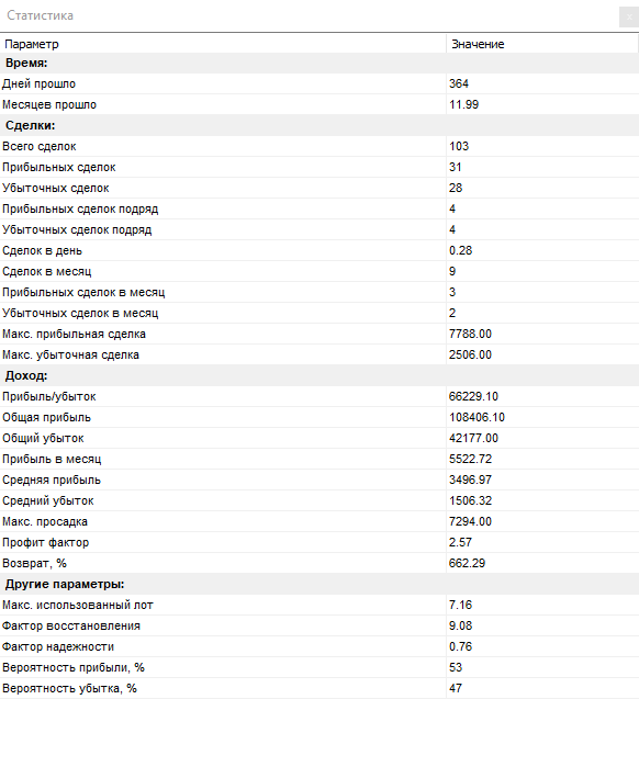 Подробная статистика по стратегии «Costik» представлена ниже в таблице: