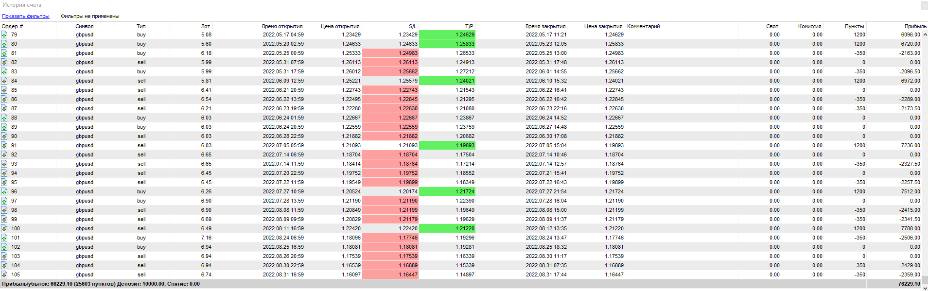 Всего за 1 год тестирования системы было открыто сделок — 103. Из них закрыто с прибылью — всего 31. Убыточных — 28, остальные — закрыты в «безубыток».