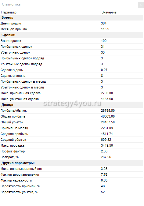 Всего было заключено сделок за 1 год теста на H1 интервале — 100. Прибыльных — всего 31. Убыточных — 33, все остальные — закрыты в ноль (по безубытку).