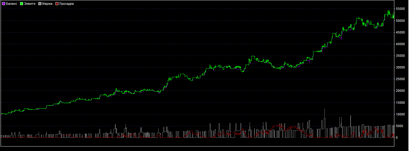 График практически равномерно восходящий, просадки так же есть, но в общем за 1 год мы закрылись практически без просадок, почти на максимуме депозита.
