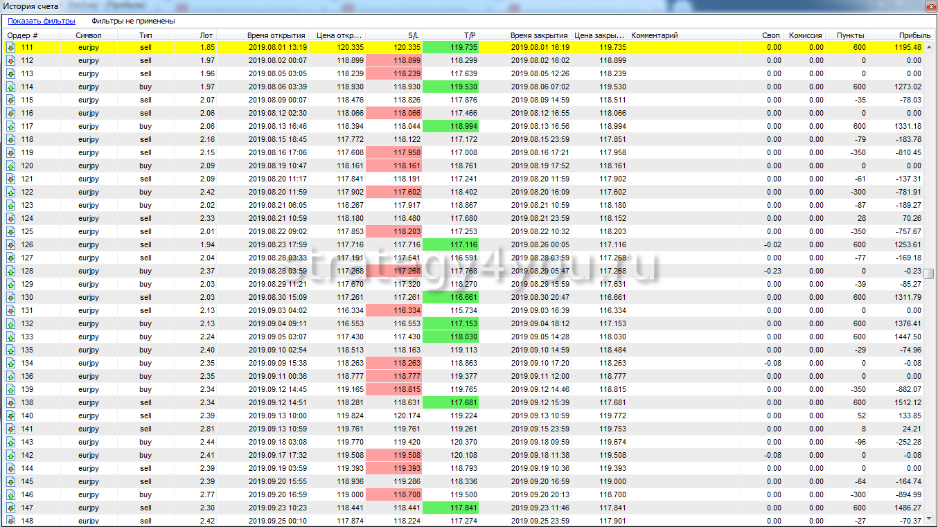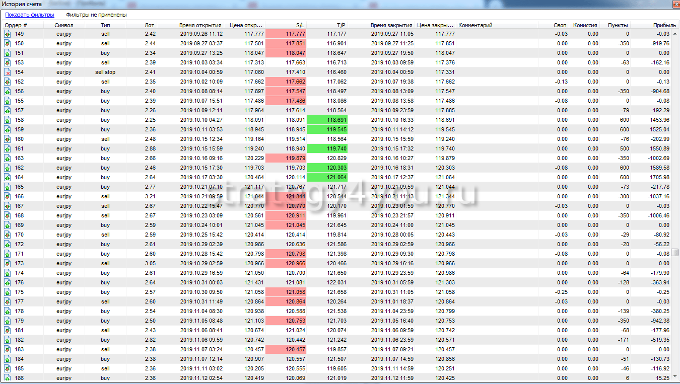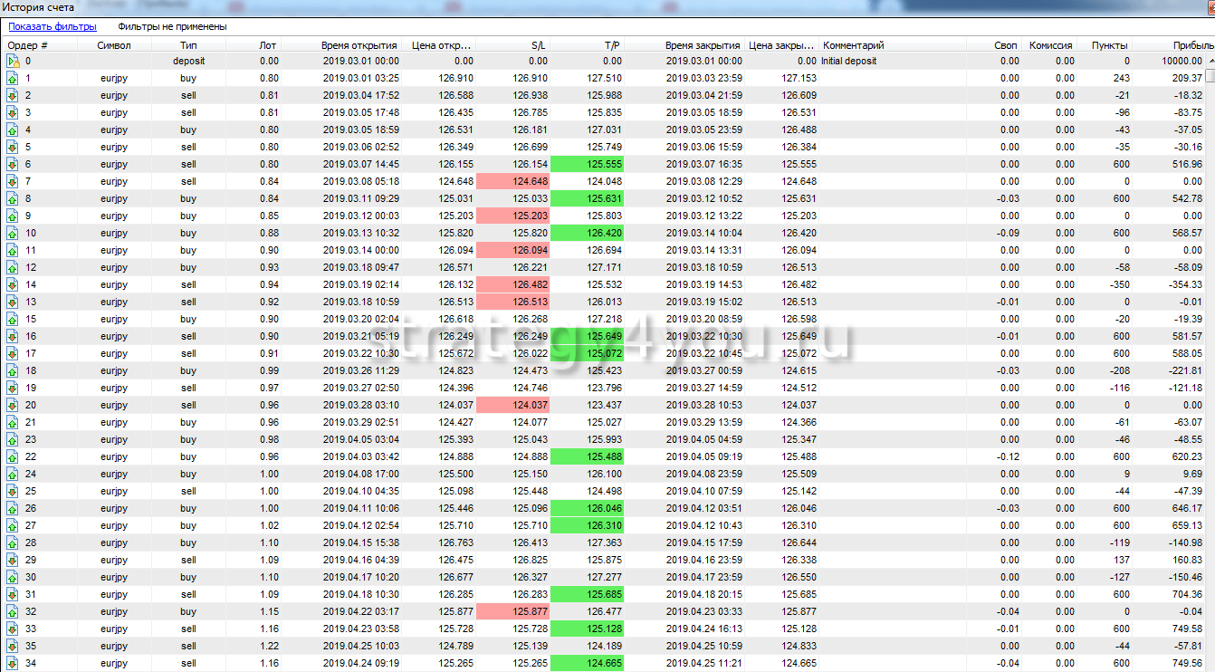 Так же публикуем для вас подробный отчет по всем сделкам за период тестирования ТС: