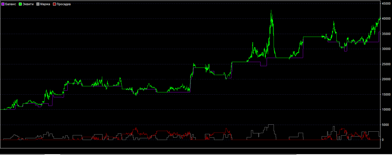 График восходящий, но не равномерно восходящий. Просадки есть и достаточно большие, хотя в общем прибыль все-равно хорошая — около 300% за 2 года.