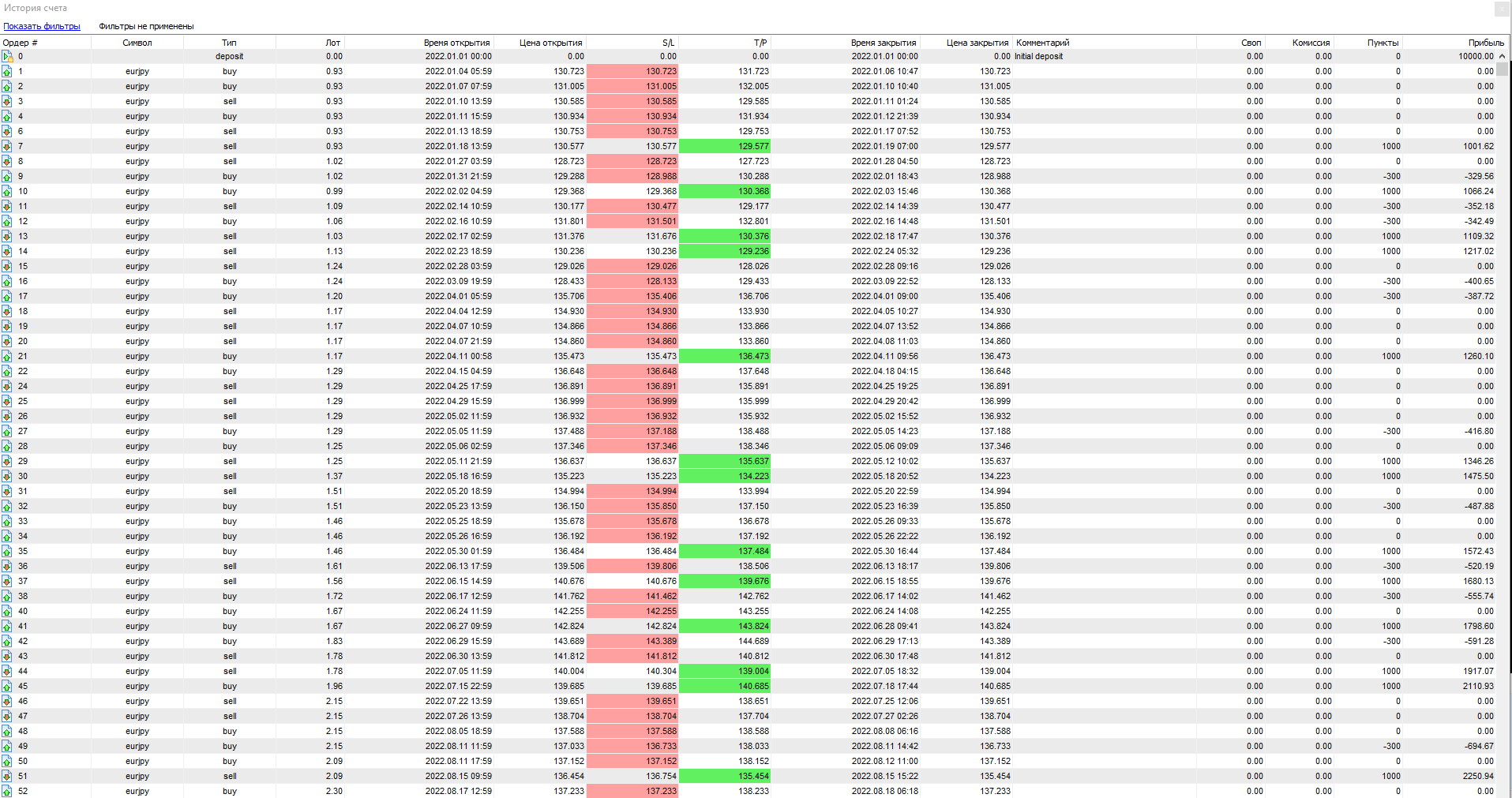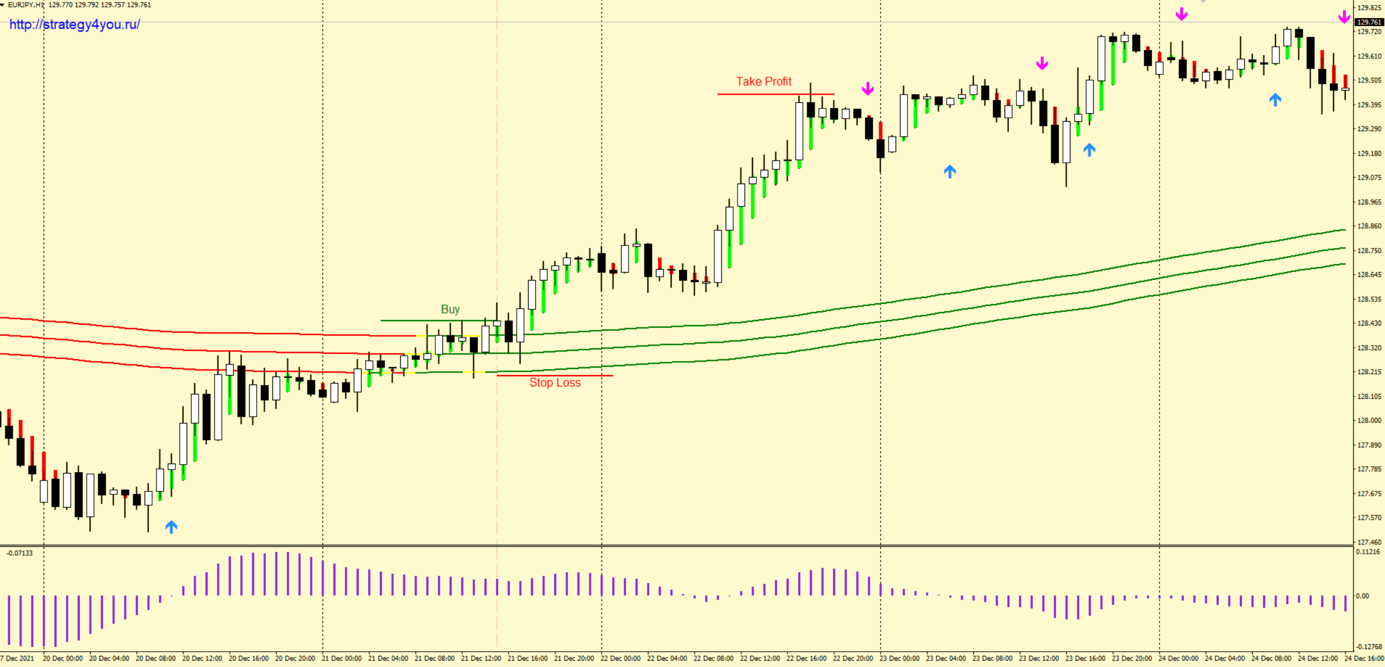 - Торговля ведется на паре: EUR/JPY, интервал — H1.
