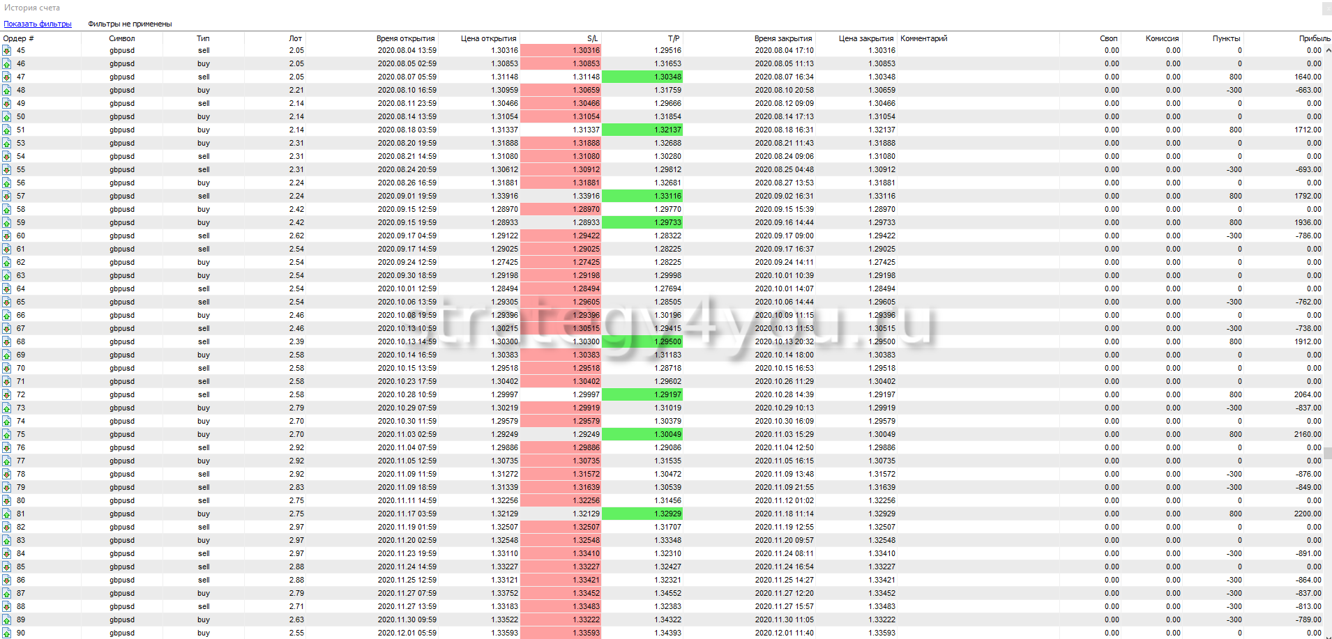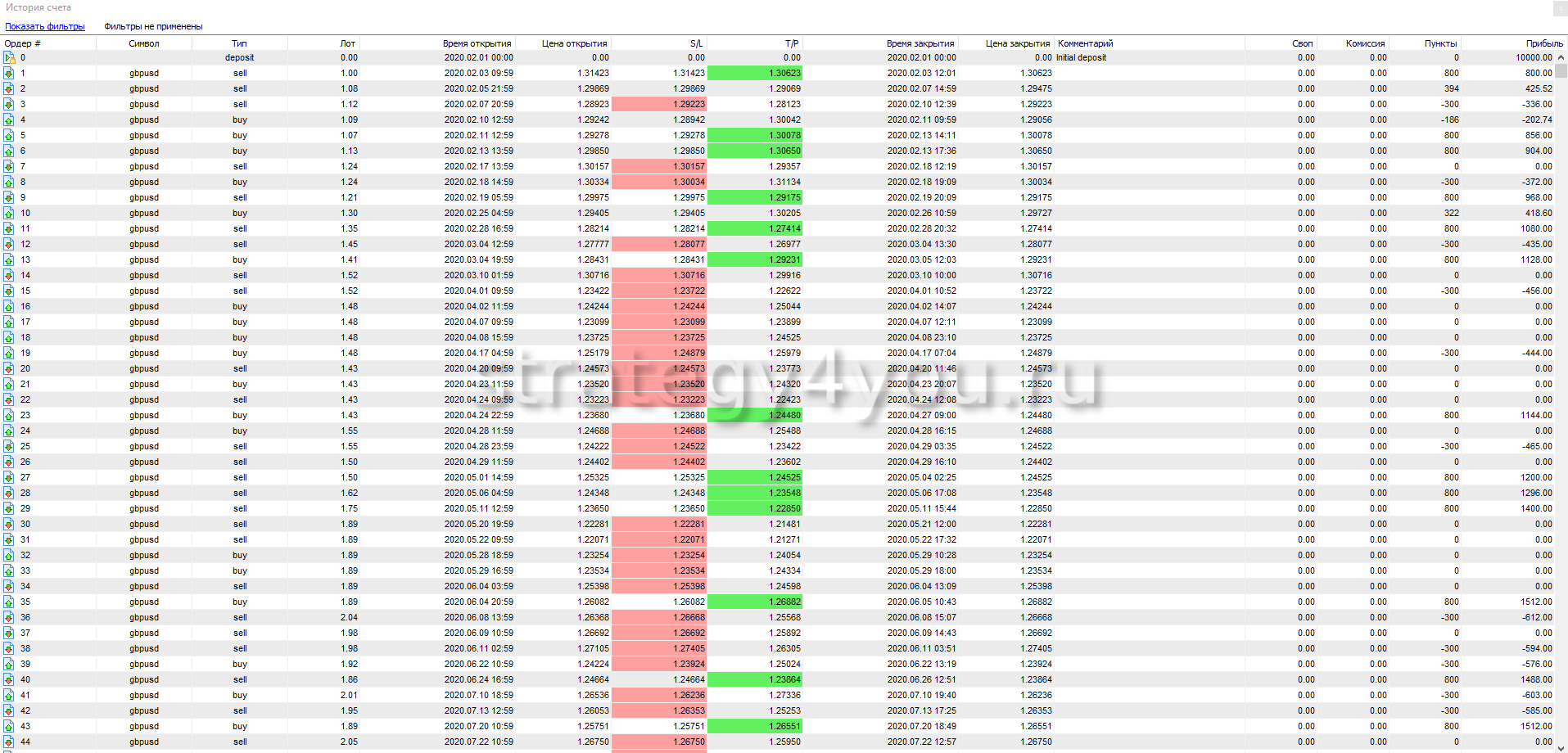 Подробный отчет по всем заключенным сделкам за период тестирования по торговой стратегии «GISHO»: